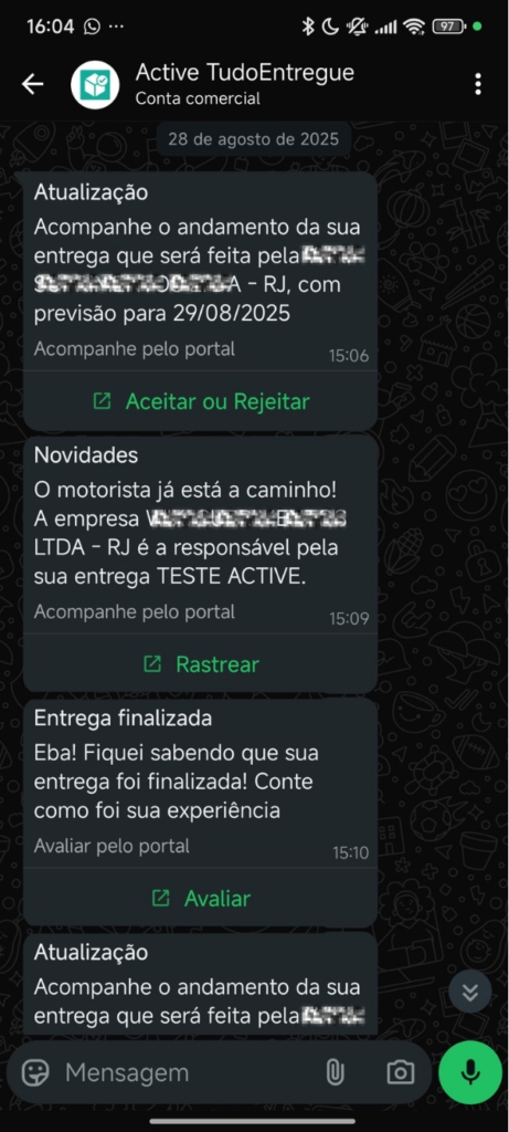 Já o seu cliente recebe notificações automáticas e um link de rastreio personalizado, com as informações da sua marca e contato direto. Além disso, quando o pedido estiver próximo do destino o cliente também recebe mensagens diretamente no WhatsApp de forma automática.